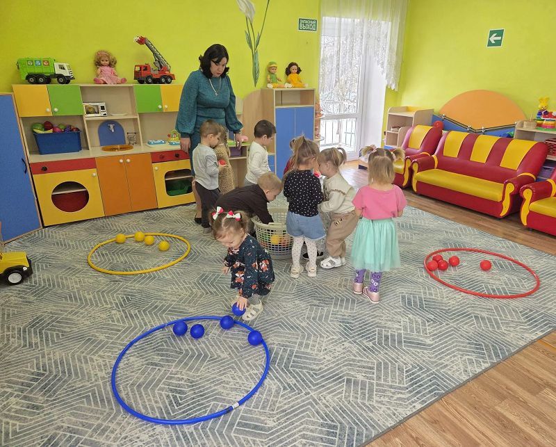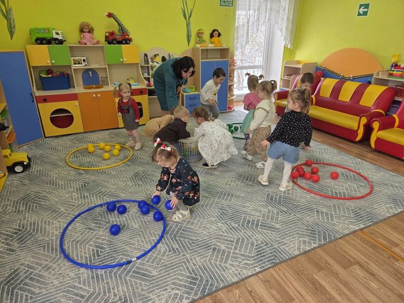 В группе малыши изучали основные цвета: синий, жёлтый, красный и зелёный. Играли в дидактические игры "Найди предметы такого цвета ", " Разложи по цветам".