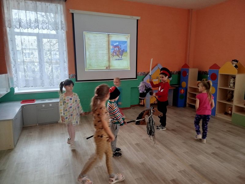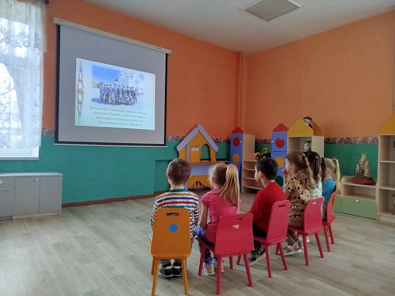 В начале занятия дети прослушали песню «Эх, Донские казаки». Затем воспитатель Яфина И.В. предложила отправиться в путешествие в прошлое к нашим предкам казакам. Ребята просмотрели презентацию, из которой узнали кто такие казаки-защитники. Рассмотрели их одежду. Еще узнали, как воспитывали казаков на Дону, что мальчиков с детства готовили к будущей военной службе.