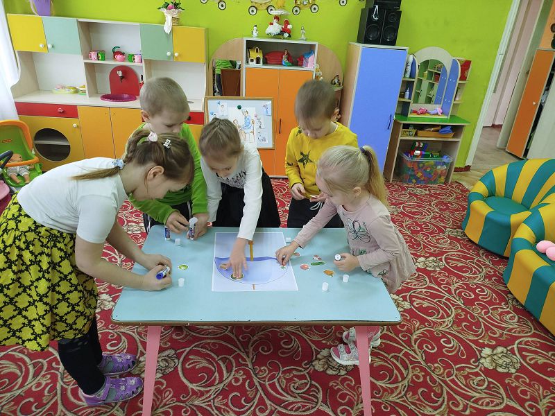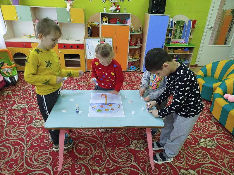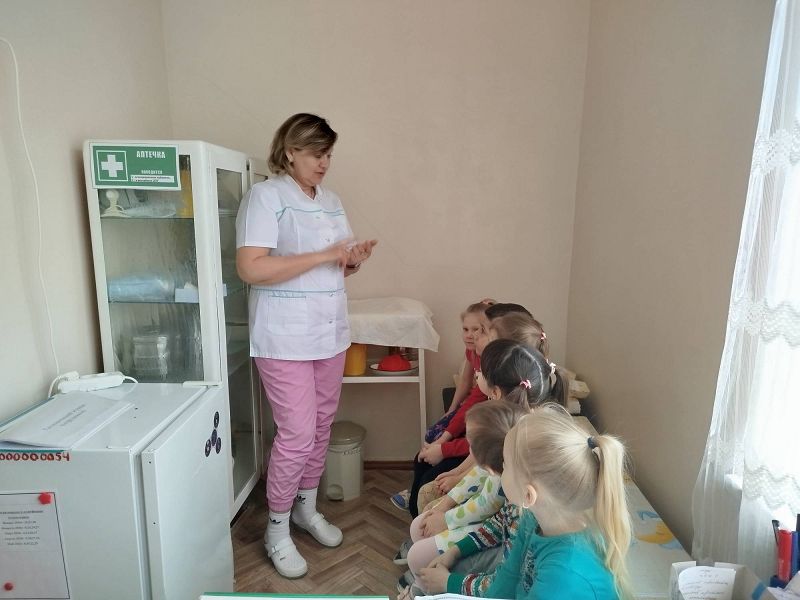 Посетили медицинский кабинет детского сада, медсестра рассказала о важности и необходимости следить за своим телом, чистить зубы, мыть руки, заниматься спортом, и чтобы не ходить к врачам нужно есть побольше фруктов и овощей. В завершении занятия дети выполнили творческую работу «Зонтик витаминов». Ребята выбирали картинки с фруктами и овощами и приклеивали их на зонтик.