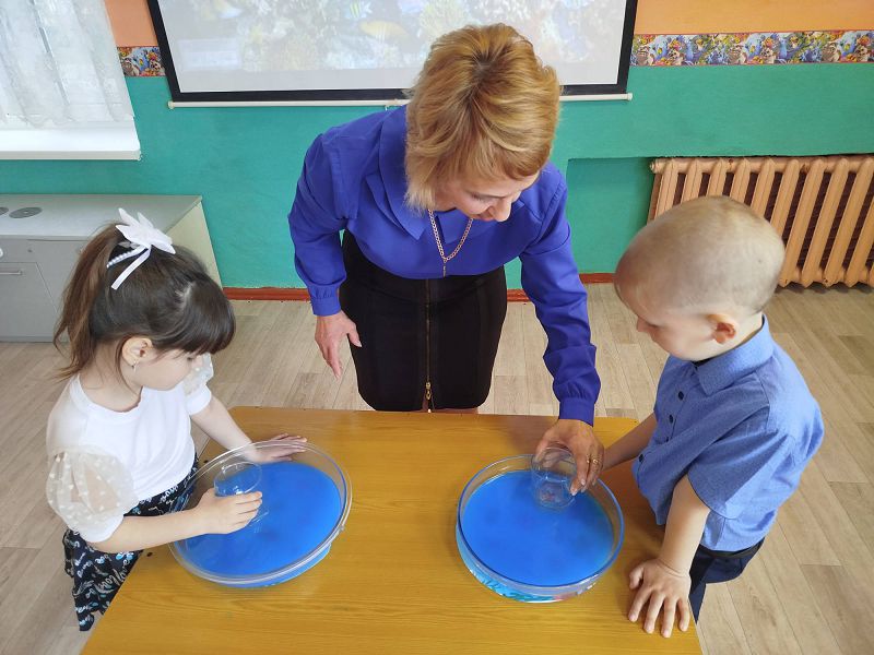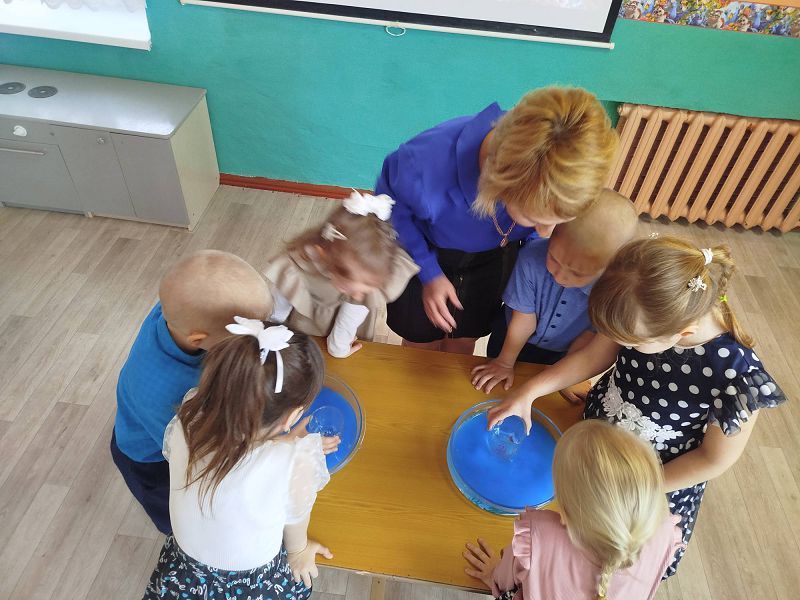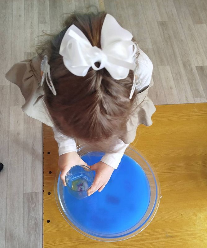 Где перед ними на столе стояла емкость с голубой водой, дети с помощью стакана аккуратно передвигали его по дну, рассматривая картинку.
