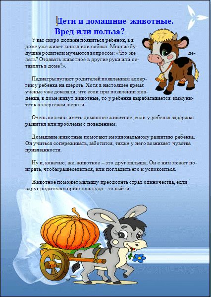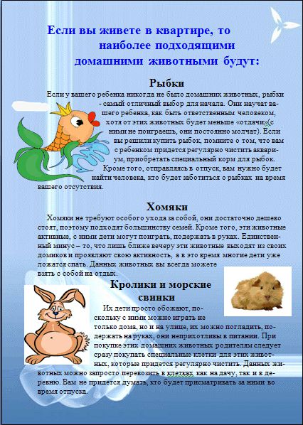 Дети быстро находят общий язык с животными. Однако не все могут или хотят держать дома животных. Ведь взять животное в дом – это большая ответственность перед ними и перед окружающими людьми. Любить животных и любить с ними поиграть, погладить это не одно и то же. Любовь к животным требует и времени, и терпения, и труда, и забот, и средств. Не заводите животное только для ребенка. Это должен быть общий любимец семьи.