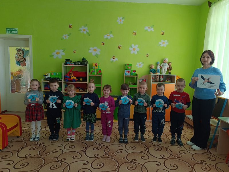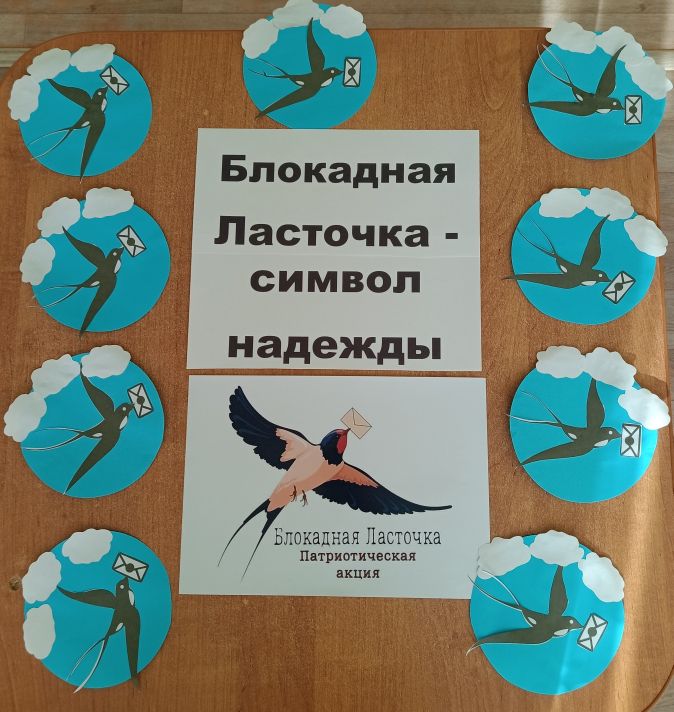 Воспитатель Ульянчик Е. В. рассказала детям об истории возникновения блокадной ласточки символе патриотической акции - маленьком жестяном значке, на котором ласточка с письмом в клюве. Весной 1942 года его начали носить на одежде многие жители Ленинграда - этот символ стал ответом на заявление фашистов о том, что теперь в город даже птица не пролетит.