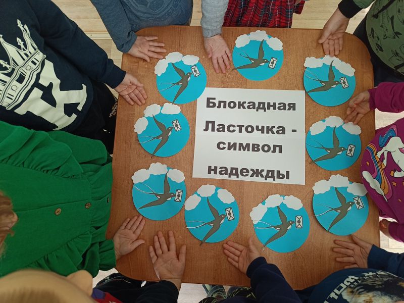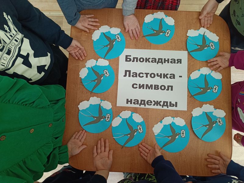 Ребята занимались творческой деятельностью: наклеивали птичек "Блокадную ласточку". Данная акция напоминает нам о том, что даже в самые трудные времена можно сохранить надежду и веру в лучшее. Она призывает нас никогда не сдаваться и помнить о подвигах наших предков.