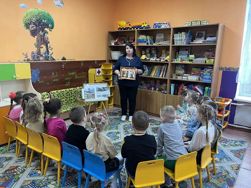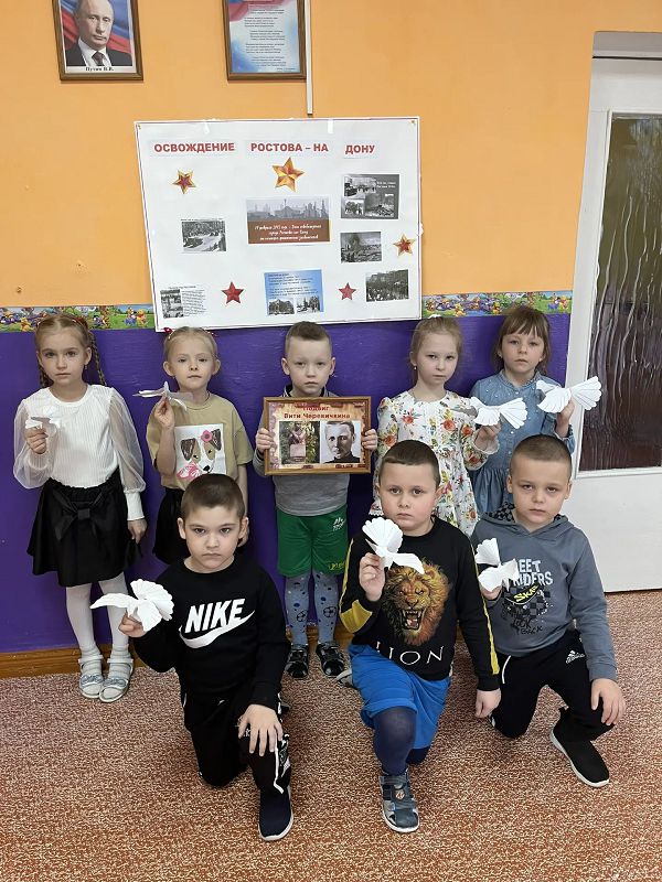 Воспитатель Рассихина Ю. С. провела беседу, из которой дети узнали о жизни семьи Вити Черевичкина и о его подвиге, который он совершил.
