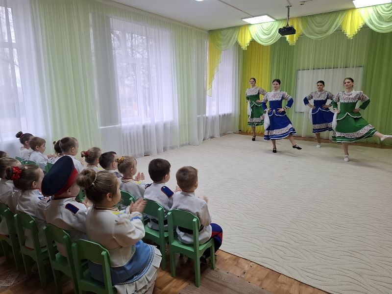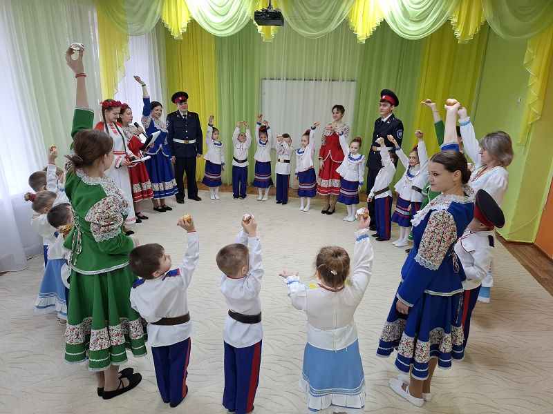 Наш детский сад посетили студенты Тацинского казачьего кадетского техникума. Они познакомили детей с традициями и историей праздника. Мероприятие сопровождалось пением песен, весёлыми танцами. Дети с интересом приобщались к народной культуре.